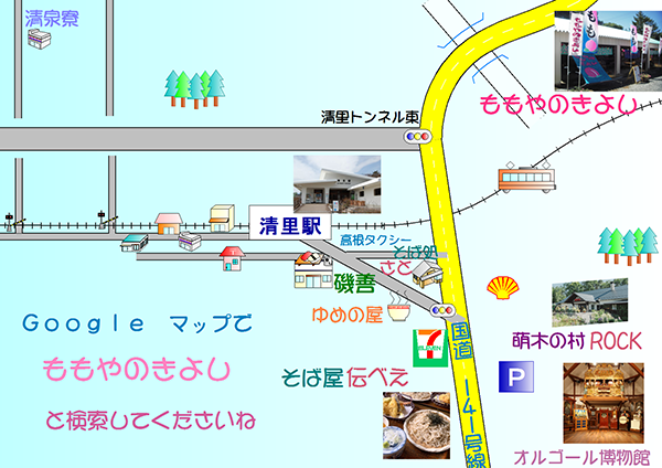 須玉インターチェンジから20km。中央道須玉インターチェンジから右に曲がって国道141を車で約30分ですあとはずっとまっすぐ、 松本、長野方面から来る方は中央道長坂インターで降りて下さいね。。 ※駐車場30台 ※ワンちゃん、ネコちゃんを連れてのお客様も大歓迎ですよ ナビだと間違えて違う所に行っていまうことがあります Googleマップでももやのきよしと検索かけて下さい お店まで 間違いなく来れるように設定してあります